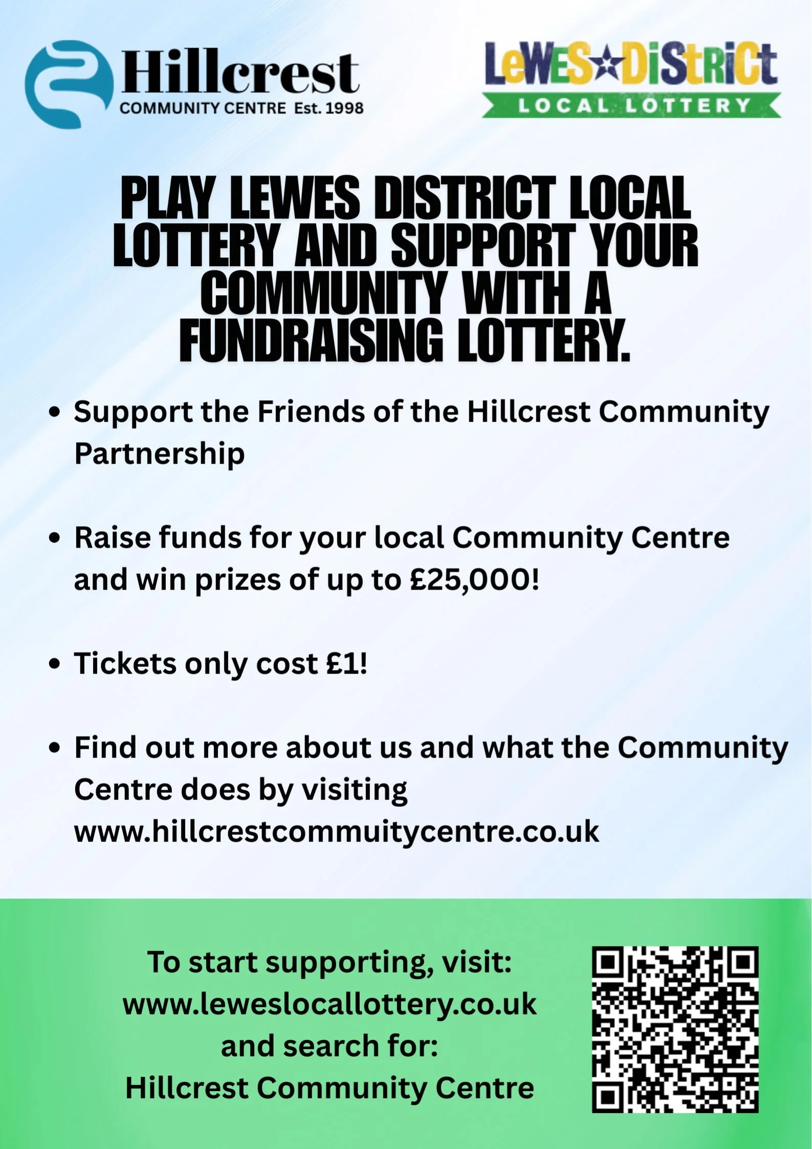 Join in on the Lewes District Local Lottery and help support the Hillcrest Centre. Only £1 per ticket and weekly jackpots of up to £25,000!! To buy tickets, click the link below.