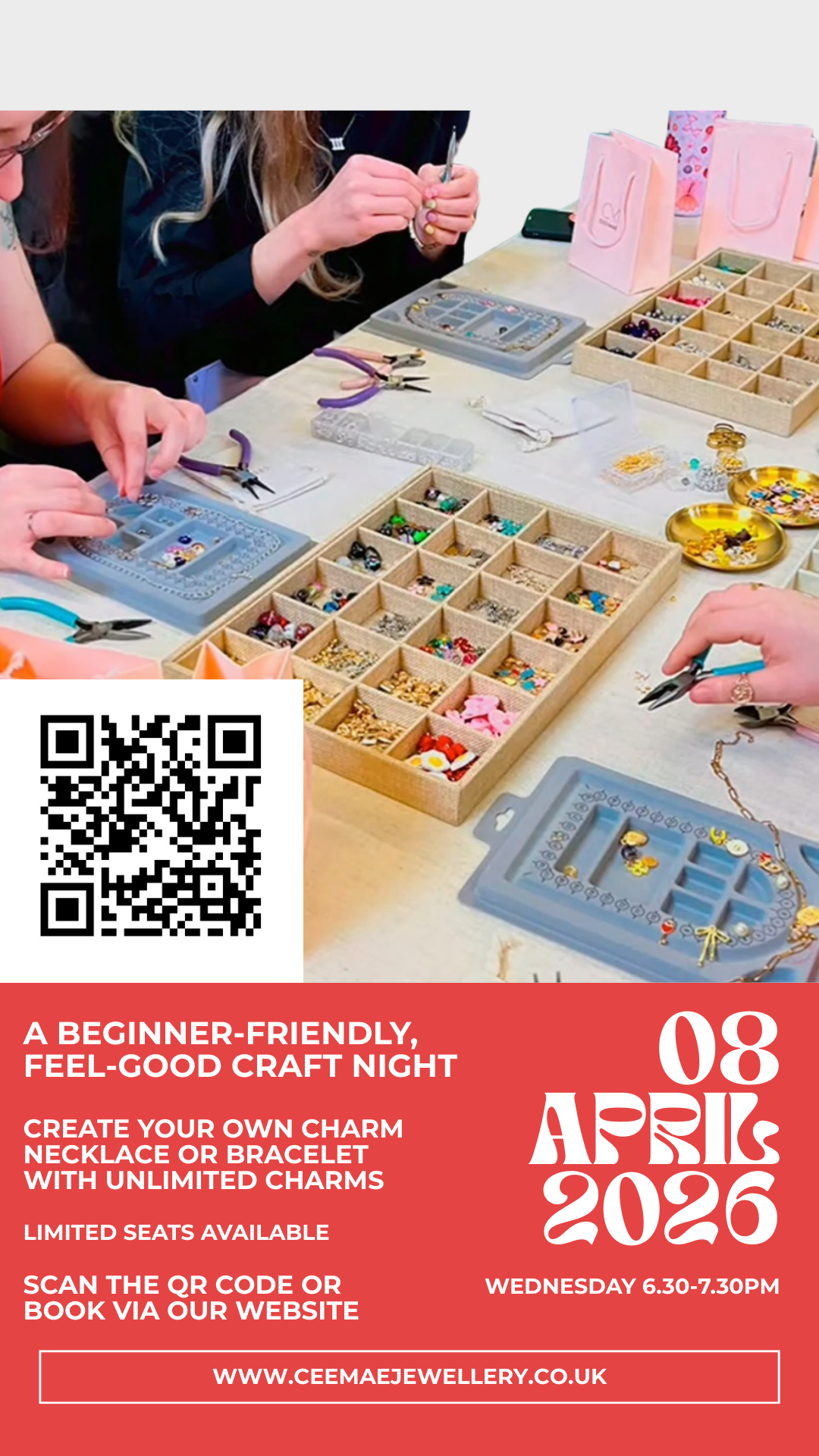 Create your own charm bracelet or necklace — perfect for beginners and packed with unlimited charms to play with. A cosy, creative evening to unwind and make something you’ll love.